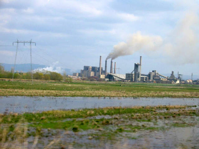 Der Fluß Sitnica bei Prishtina / Kosovo, im Hintergrund Braunkohlenkraftwerk Kosova